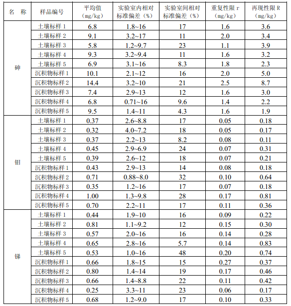 11.3 每批次樣品至少按10%的比例進行平行雙樣測定,樣品數(shù)量少于10個時,應(yīng)至少測定一個平行雙樣。平行雙樣測定結(jié)果中,電熱板消解測定鈷(Co)、銅(Cu)、鉻(Cr)、錳(Mn)、鎳(Ni)、鉛(Pb)、鋅(Zn)、釩(V)、砷(As)的相對偏差應(yīng)小于30%,鎘(Cd)、鉬(Mo)、銻(Sb)的相對偏差應(yīng)小于40%;微波消解測定12種金屬元素的相對偏差應(yīng)小于30%。