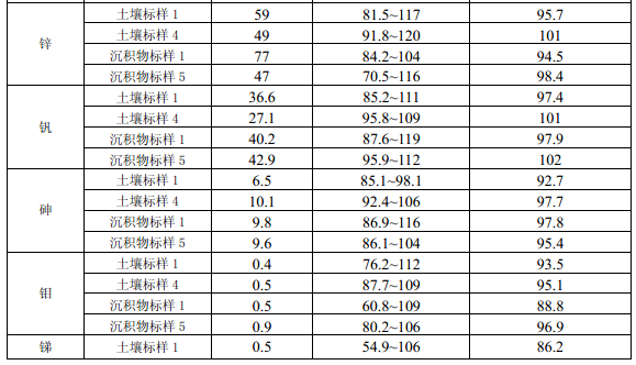 11.4 每批次樣品至少分析10%的加標回收樣,樣品數(shù)量小于10個時,應(yīng)至少做一個加標回收樣。加標回收樣測定結(jié)果中,電熱板消解測定鎘(Cd)、鈷(Co)、銅(Cu)、鉻(Cr)、錳(Mn)、鎳(Ni)、鉛(Pb)、鋅(Zn)、釩(V)、砷(As)的加標回收率應(yīng)控制在70%~125%之間,鉬(Mo)、銻(Sb)的加標回收率應(yīng)控制在50% ~125%之間;微波消解測定12種金屬元素的加標回收率應(yīng)控制在70%~125%之間。