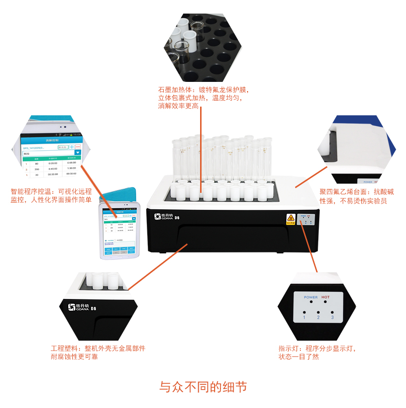 D6智能石墨消解儀采用高純石墨材料作為加熱體,包裹式加熱,效率更高,溫度均勻性更好。多孔設計,輕松實現樣品的批量處理,D6石墨消解儀是您樣品消解的好伴侶。