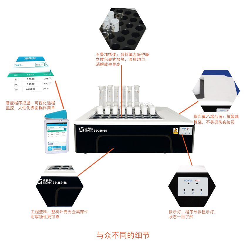 DS-360-56智能石墨消解儀具有56孔高通量設計,可快速實現樣品批量處理,滿足樣品量大的消解用戶;石墨材料作加熱體,孔間溫差±1.5℃,溫度均性好;無線控制,有效避免人員被酸霧及熱量傷害;設備操作簡單,消解快速,是樣品元素分析時消解的好助手。
