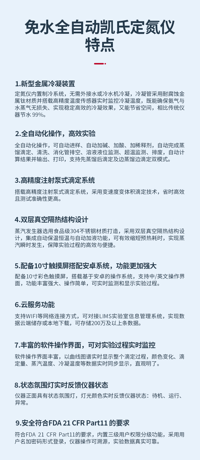 定氮儀內置制冷系統,無需外接水或冷水機冷凝,冷凝管采用耐腐蝕金屬鈦材質并搭載高精度溫度傳感器實時監控冷凝溫度,既能確保氨氣與水蒸氣無損失、實現穩定高效的冷凝效果,又能節省空間,相比傳統儀器節水 99%。