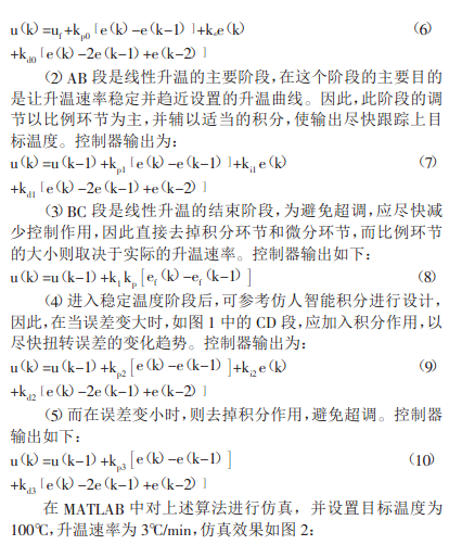 根據(jù)系統(tǒng)特性,設(shè)計(jì)控制規(guī)則如下: (1)在啟動階段,由于系統(tǒng)存在一定的時滯和較大的慣性,必須加以比較強(qiáng)的控制作用,才能使系統(tǒng)盡快響應(yīng)因此應(yīng)根 據(jù)本階梯的穩(wěn)定溫度和升溫速率加入前饋控制量 ,控制器輸出為:
