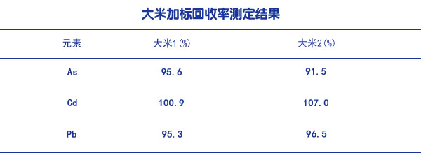同時,還選取了2個未知含量的大米樣品進行全流程加標回收試驗,測定結果見表(大米標準樣品加標回收率測定結果),加標回收率均在91.5%~107%,基本滿足測試準確度要求。
