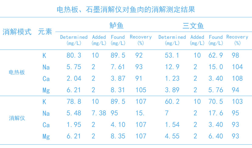 電熱板濕法全消解、石墨消解儀半消解對(duì)樣品前處理方法對(duì)鱸魚(yú)和三文魚(yú)進(jìn)行分析,結(jié)果表明上述消解方法均具有較好的精密度和準(zhǔn)確度。其中的石墨消解儀消解方法能夠更加有效、快速、綠色地測(cè)定魚(yú)肉中常見(jiàn)的幾種營(yíng)養(yǎng)元素。